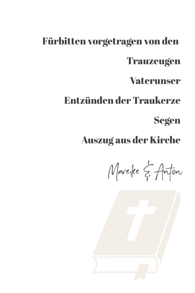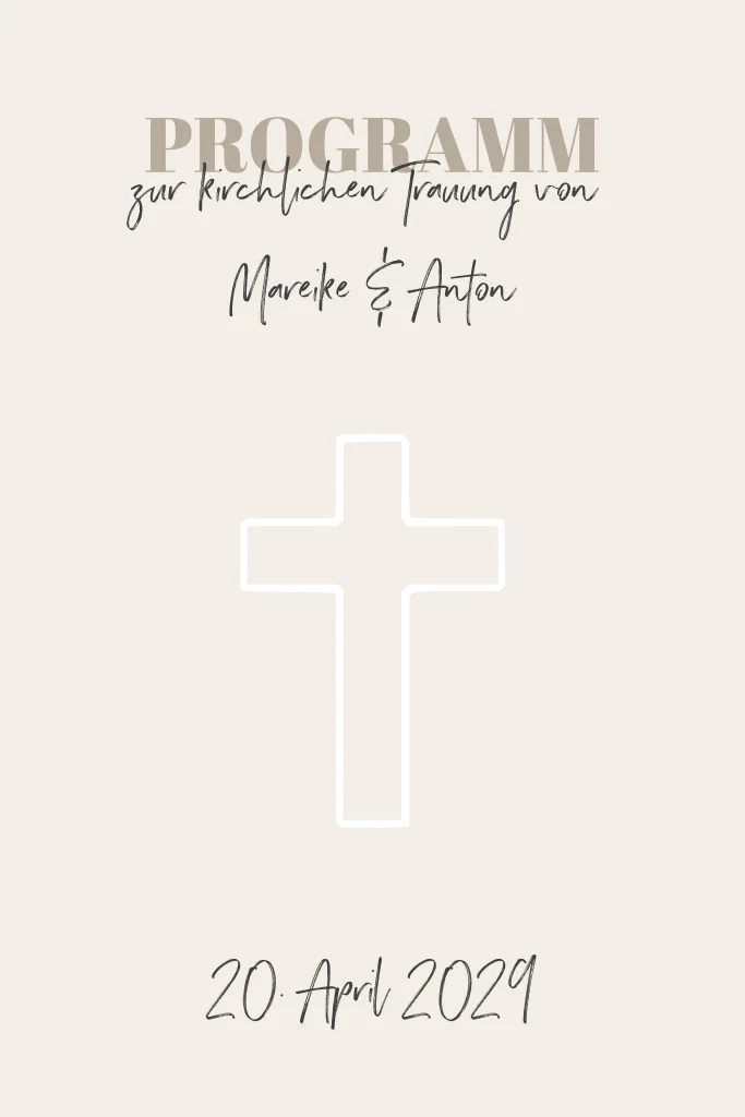 Modernes Programmheft für die kirchliche Trauung in beige. Die Klappkarte im Hochformat ist mit einem silberfarbenen Kreuz veredelt. Im Innenteil befindet sich genügend Platz für Euren Ablauf. Zudem ziert die Innenseite eine Bibel.