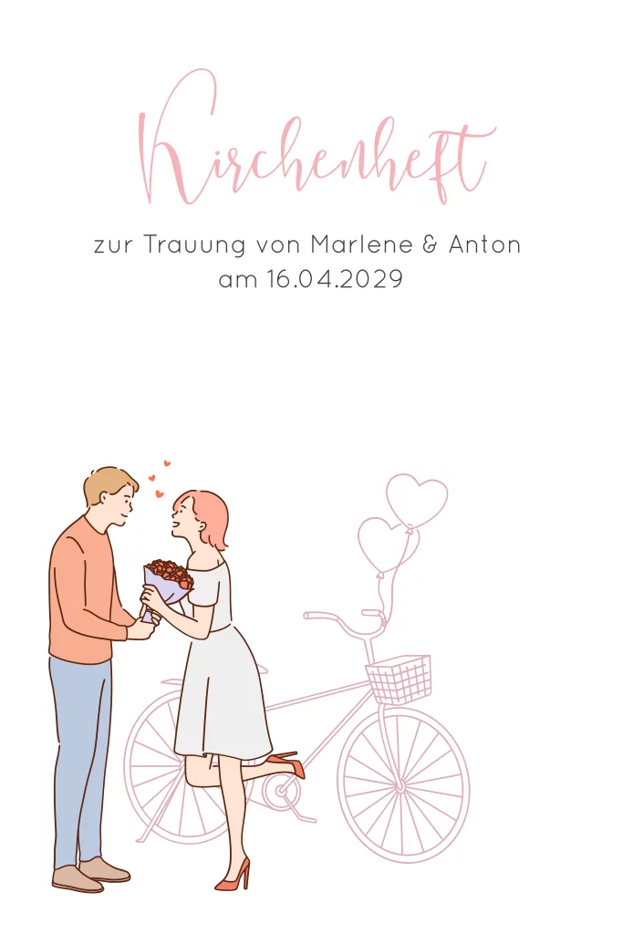 Kirchenheft zur Hochzeit mit Fahrrad in rosa und verliebtem Paar