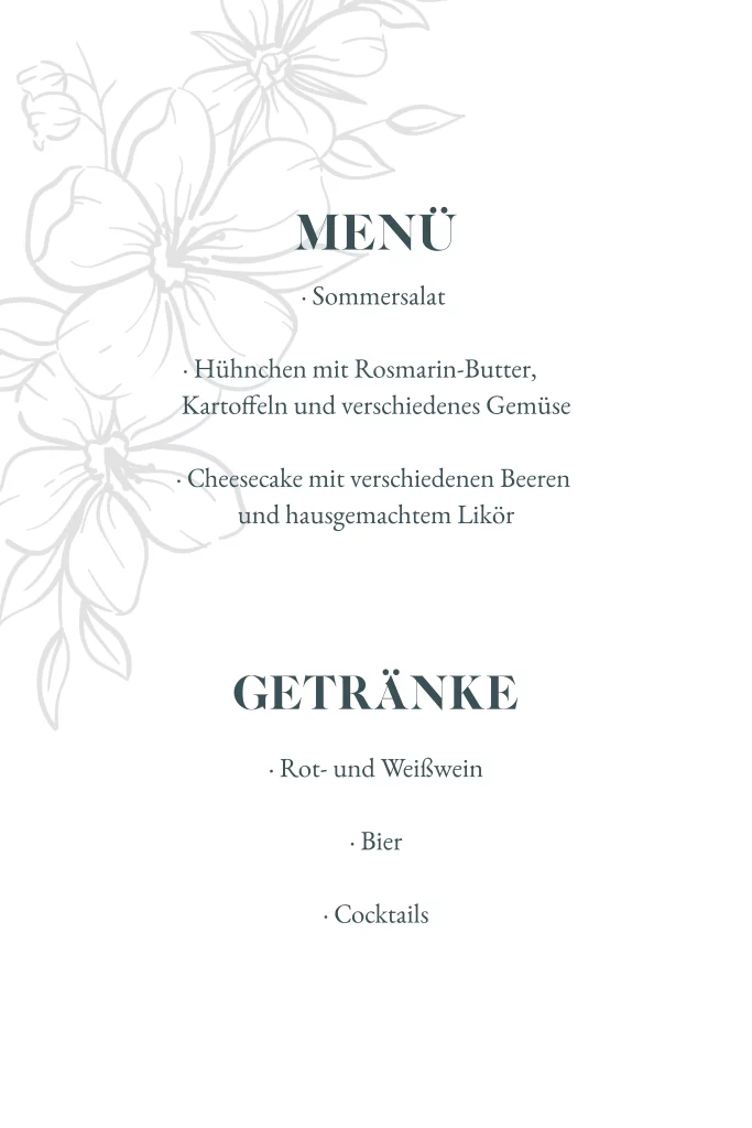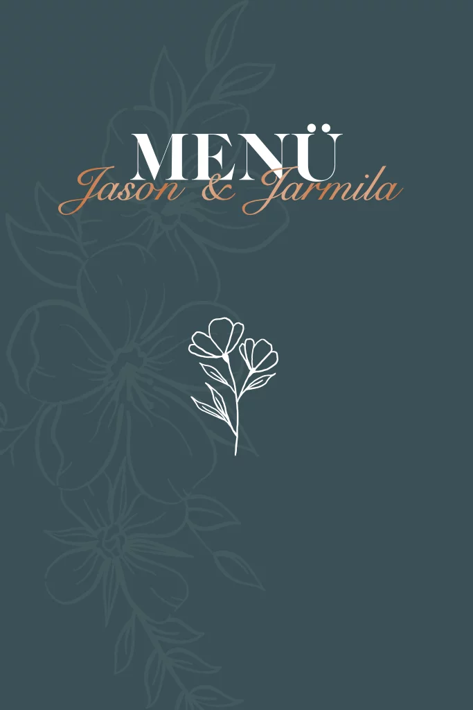 Moderne, dunkelblaue Menükarte zur Hochzeit als Klappkarte. Die Karte wird mit Line Art Blumen und Kupferfolierung verziert.