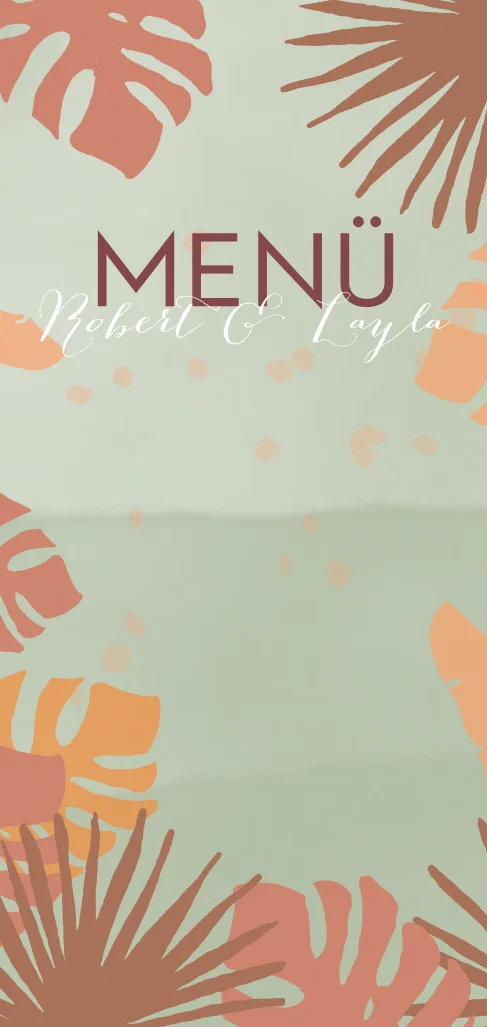 Menükarte in warmen Farben und Palmenblättern