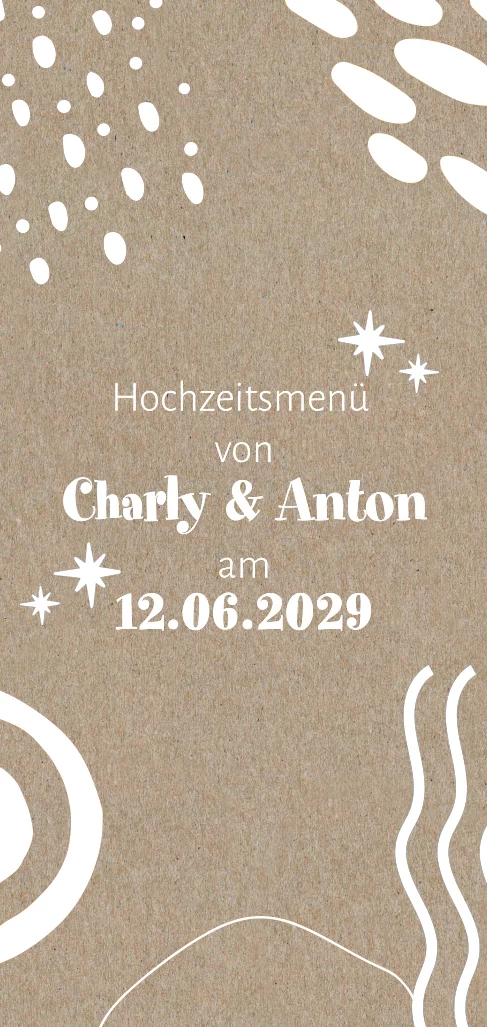 Boho Speisekarte zur Hochzeit aus Kraftpapier mit verspielten ausgefallenen weißen Formen.