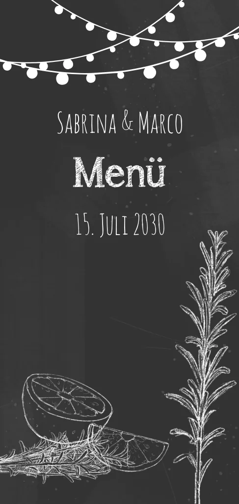Menükarte zur Hochzeit im Schiefertafel Look mit Zitrone und Rosmarin