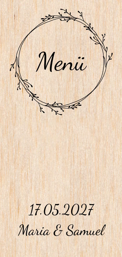 Schlichte Menükarte aus Echtholz mit Line Art Kranz