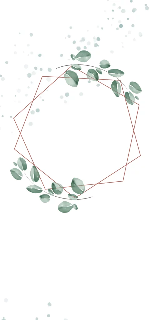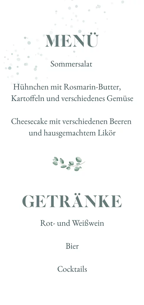 Klappkarte als Menükarte mit geometrischem Rahmen, Roségoldfolierung und grünen Sprenkel.