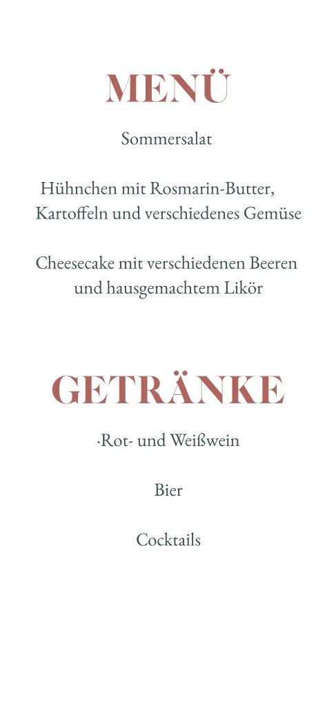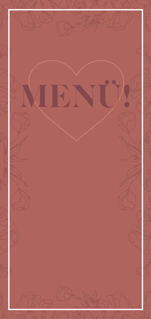 Die Menükarte in Samtrot hat eine Goldfolierung und einen Line Art Blumenrahmen. Das Panoramahochformat der Klappkarte eignet sich perfekt, um Eure Getränke- und Essensauswahl zu präsentieren.