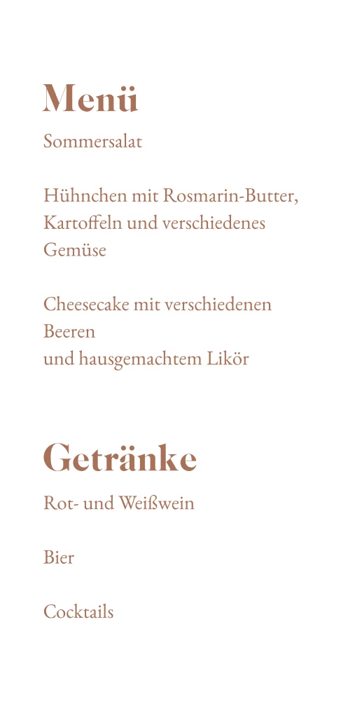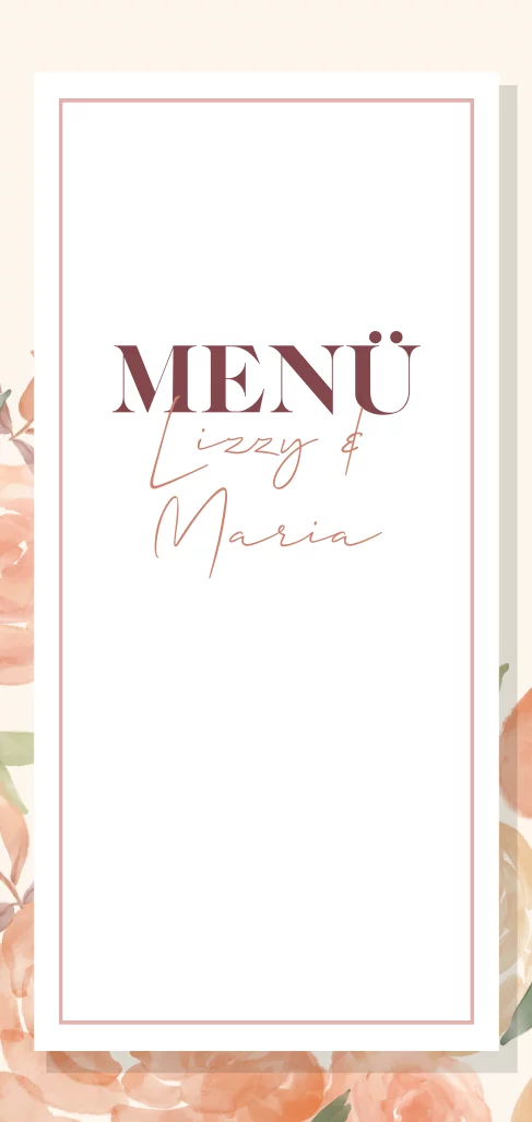 Klassische Speisekarte für das Hochzeitsmahl mit Rosen. Die Klappkarte ist in beige gehalten.