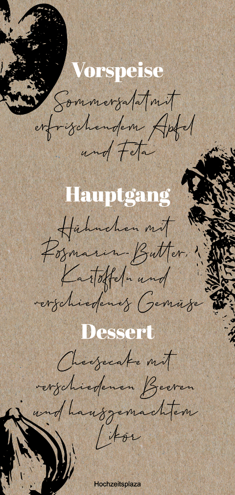 Eine Speisekarte zur Hochzeit der anderen Art. Unsere Menükarte "Das schmeckt!" aus Kraftpapier im originellem Stempeldruck-Look. Die Karte mit schwarzem Apfel, Salatblatt und Zwiebel ist etwas ganz besonderes und passt nicht nur zu einer rustikalen Hochzeit.