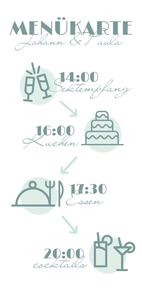 Moderne Menükarte zur Hochzeit mit Timeline und Icons