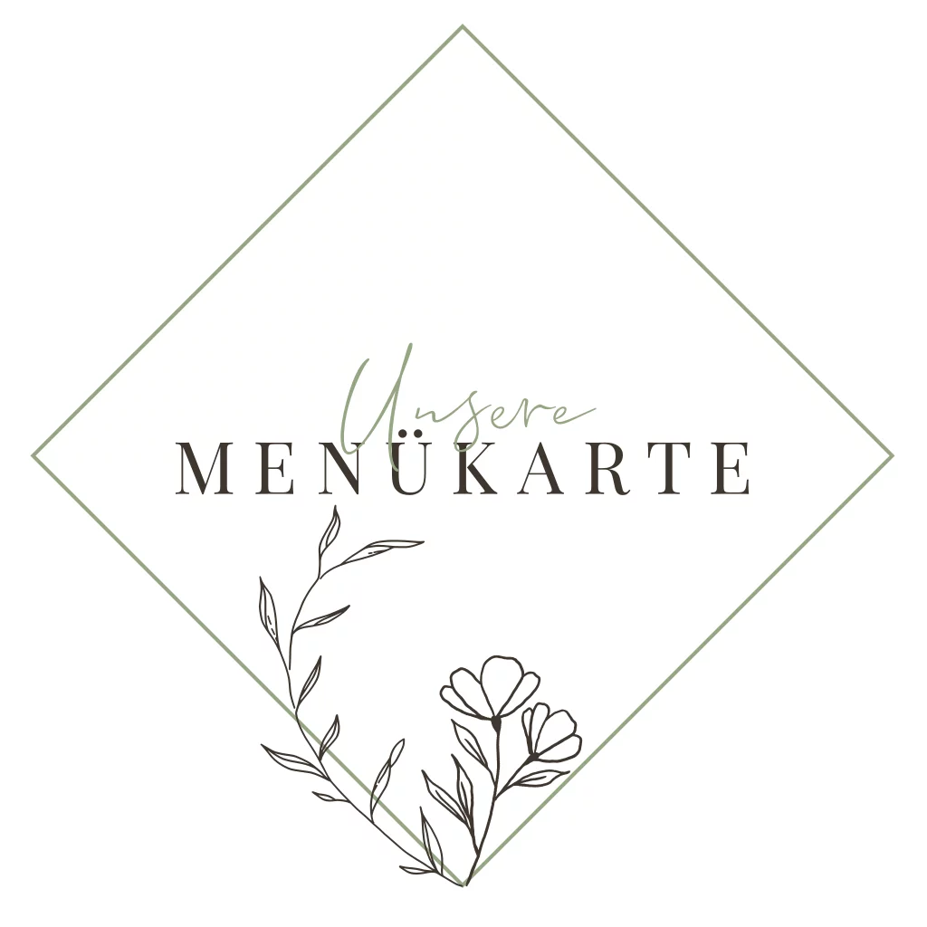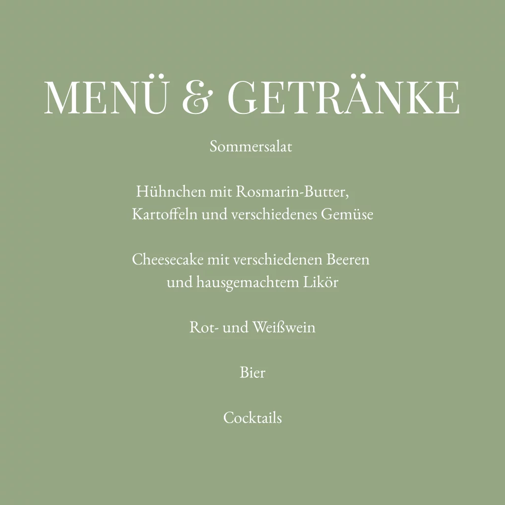 Quadratische Klappkarte als Menü für die Hochzeit. Die weiße Karte hat einen geometrischen feinen Rahmen und florale Line Art Elemente. Eine der Innenseiten ist grün.