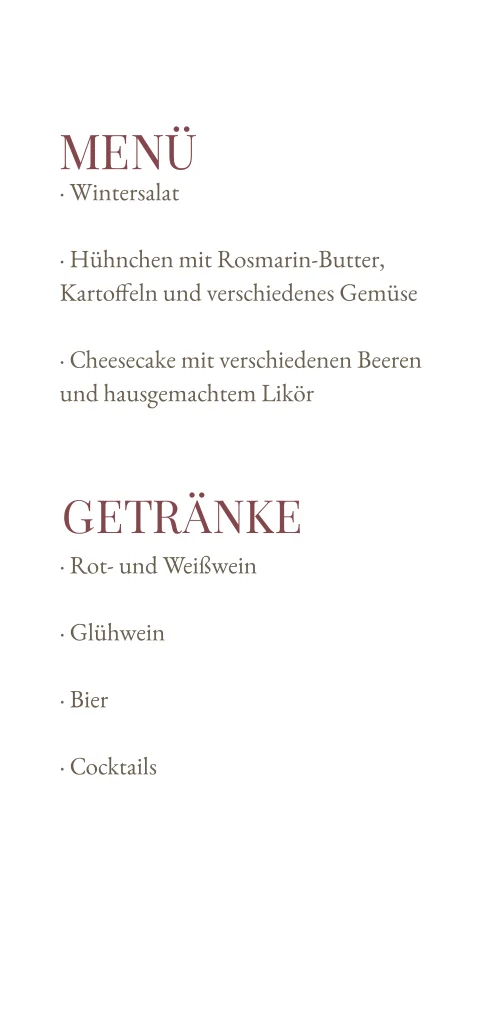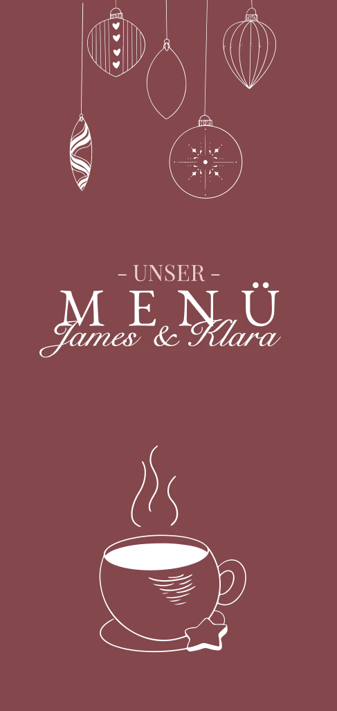 Weihnachtliche Speisekarte zur Hochzeit in rot mit foliierten Goldakzenten. Die Klappkarte mit Tee und Weihnachtsbaumkugeln kann auch für Euer Weihnachtsmenü genutzt werden.