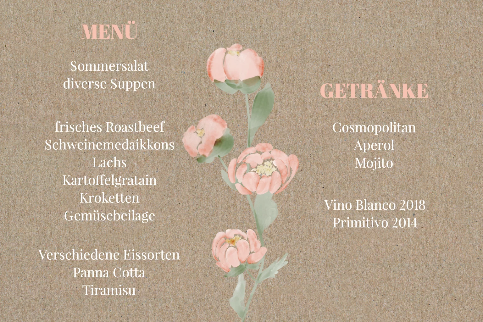 Dieses schöne Menü mit romantischen Blumenbouquet macht neugierig auf das Essen.