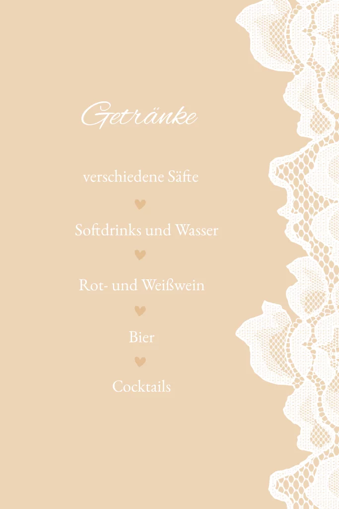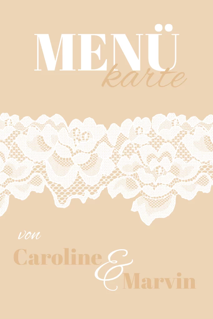 Diese romantische Menükarte mit Spitze in zartem Apricot lädt Eure Gäste dazu ein sich die Speisekarte als Erinnerung mit nach Hause zu nehmen.