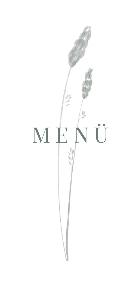 Elegant Menükarte mit Gräsern und Roségoldfolierung. Die weiße Karte im Panoramahochformat bietet ausreichend Platz für Euer Menü am Hochzeitstag.