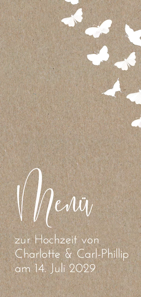 Menükarte zur Hochzeit aus Kraftpapier mit Schmetterlingen in weiß. Die schliche Karte im Hochformat bietet auf der Rückseite Platz für Euer Hochzeitsessen.