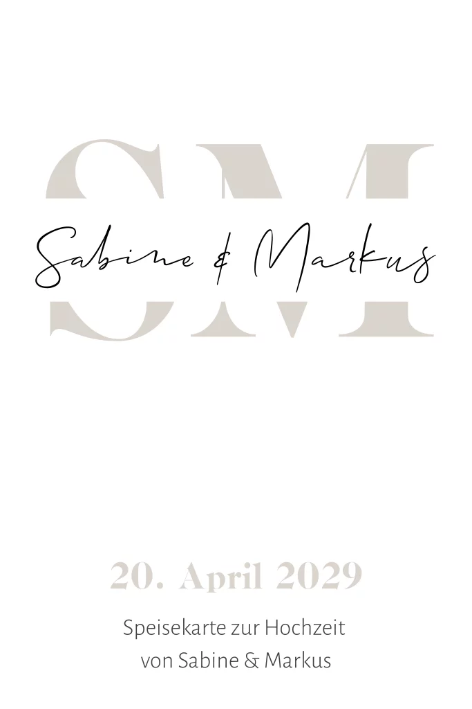 Moderne Menükarte im schlichten Stil mit Initialen in beige. Die weiße Klappkarte hat ausreichend Platz für Euer Hochzeitsmenü.