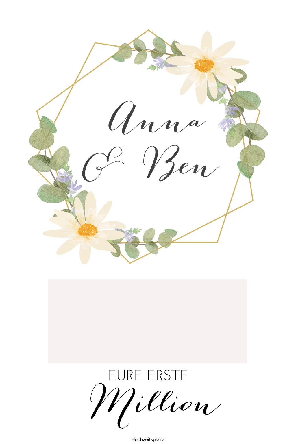Weißes Poster "Erste Million" als Geldgeschenk für das Brautpaar. Das Plakat ist mit einem modernen Goldrahmen, bunten Blumen und Eukalyptus verziert. Auf das Poster könnt ihr an der beigefarbenen Markierung das Geld für das Hochzeitspaar kleben.