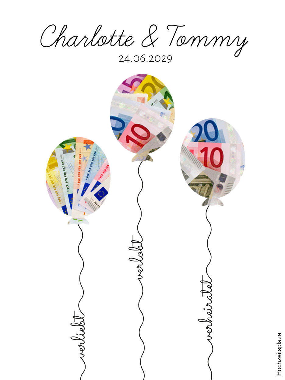Schlichtes Poster als Geldgeschenk zur Hochzeit mit Ballons und Spruch