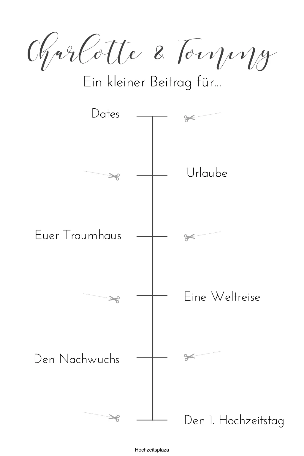 Schlichtes, weißes Poster als Geldgeschenk für das Brautpaar mit Icons und Geldschlitzen zum selbst schneiden oder Platz um das Geld aufzukleben. Die Schere wird nicht gedruckt, sondern dient nur zur besseren Vorstellung.