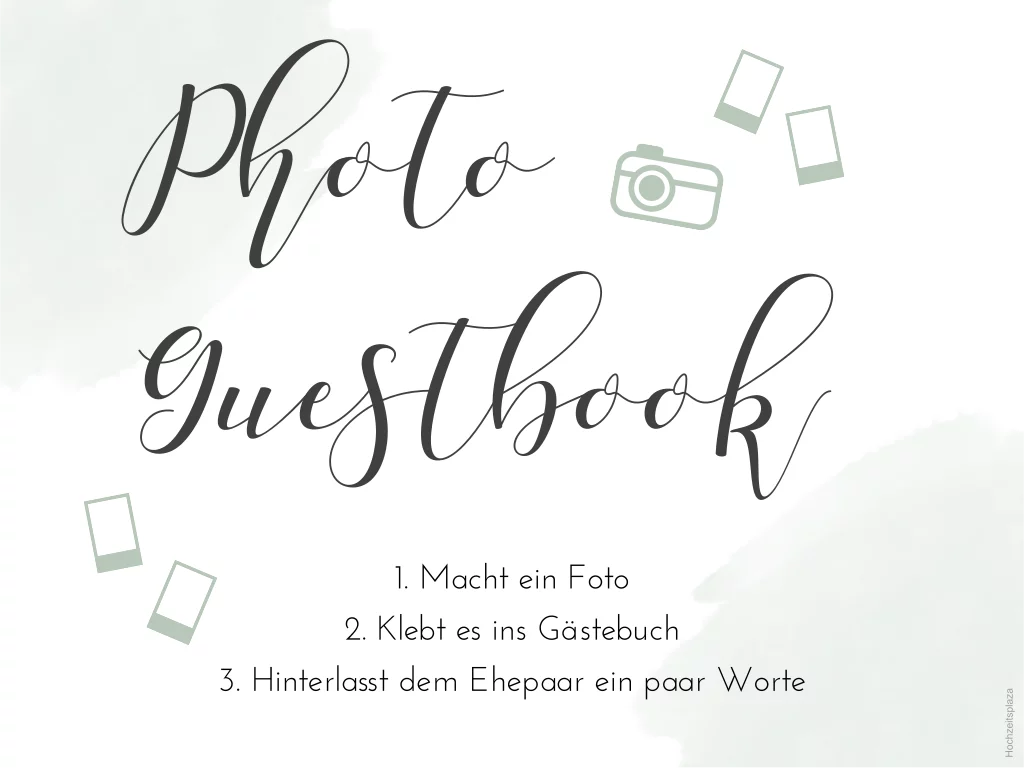 Helles Poster als Hinweisschild "Photo Guestbook" als Erinnerung um sich im Gästebuch auf der Hochzeit zu verewigen. Das Plakat ist mit Kamera, Sofortbildrahmen und Aqaurell in grün gestaltet. Stellt es am besten so auf, dass die Gäste es nicht übersehen können.