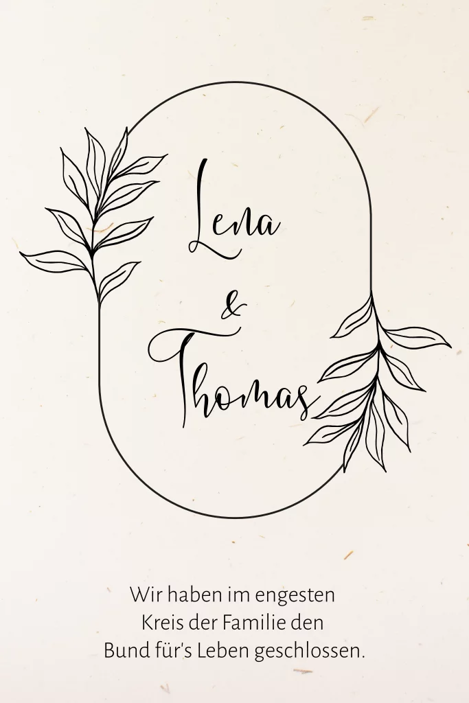 Wir-haben-geheiratet-Karte aus Recyclingpapier mit zarter Rahmung und Zweigen in schwarz.