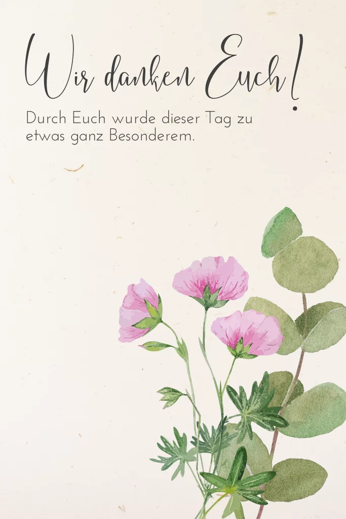 Danksagungskarte zur Hochzeit aus Recyclingpapier. Die Karte im Hochformat mit Blume in pink und Eukalyptus in grün.