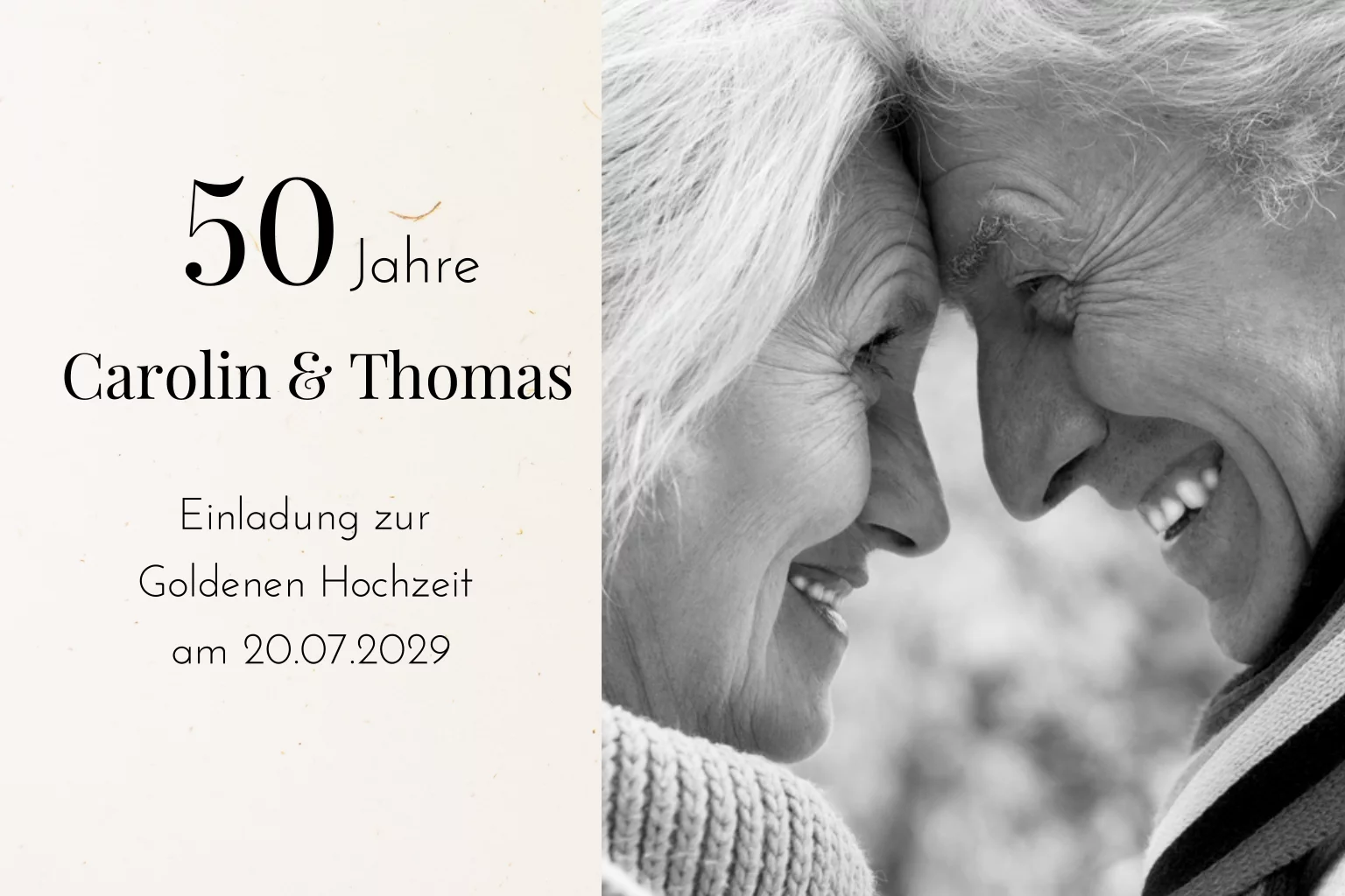 Schlichte Einladungskarte zur Goldenen Hochzeit aus Recyclingpapier mit Foto.