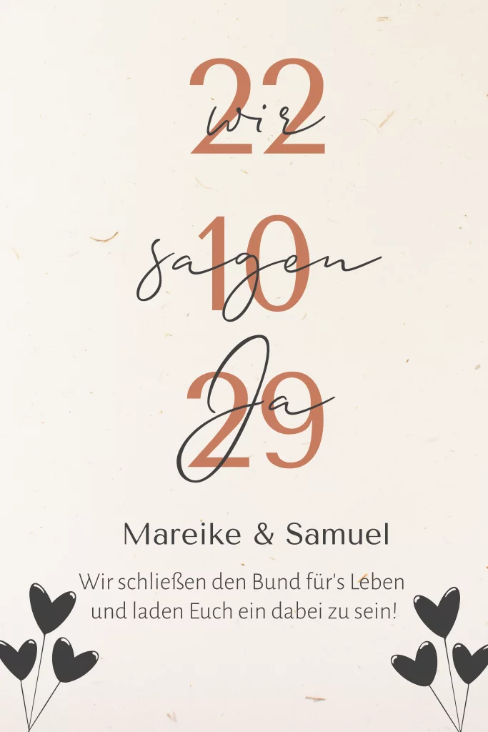 Einladung zur standesamtlichen Trauung aus Recyclingpapier mit Ballons in Herzform und Datum in orange.