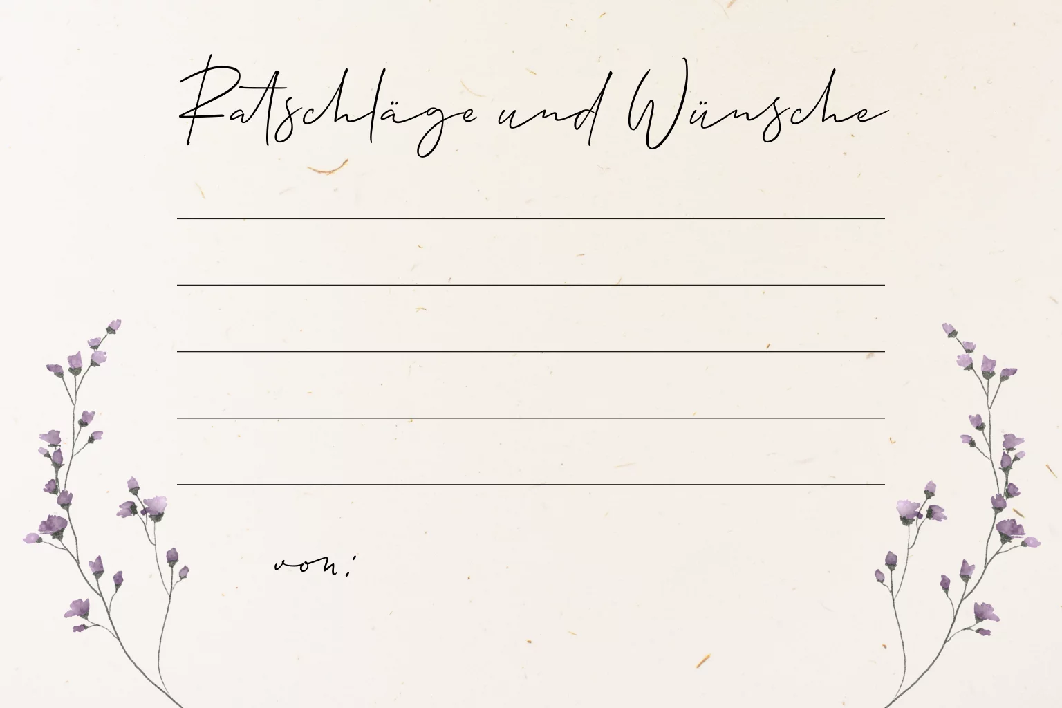Gästebuchkarte "Ratschläge und Wünsche" aus Recyclingpapier mit lila Blumen. Eine schöne Alternative zum Gästebuch.