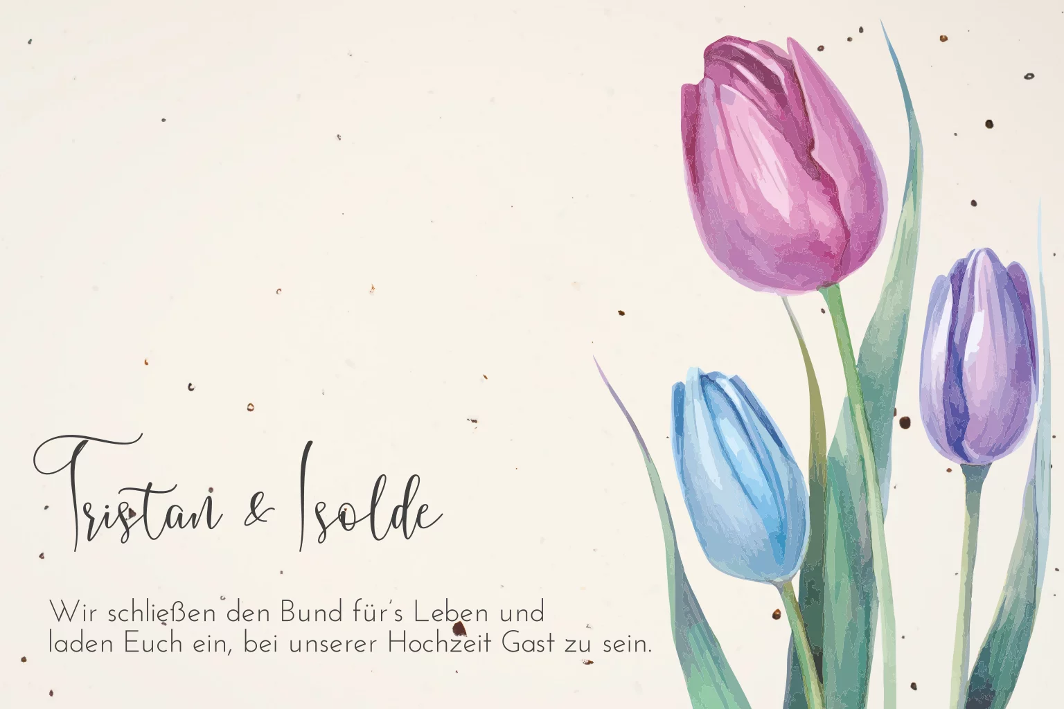Hochzeitseinladung aus recyceltem Tulpenpapier mit bunten Tulpen