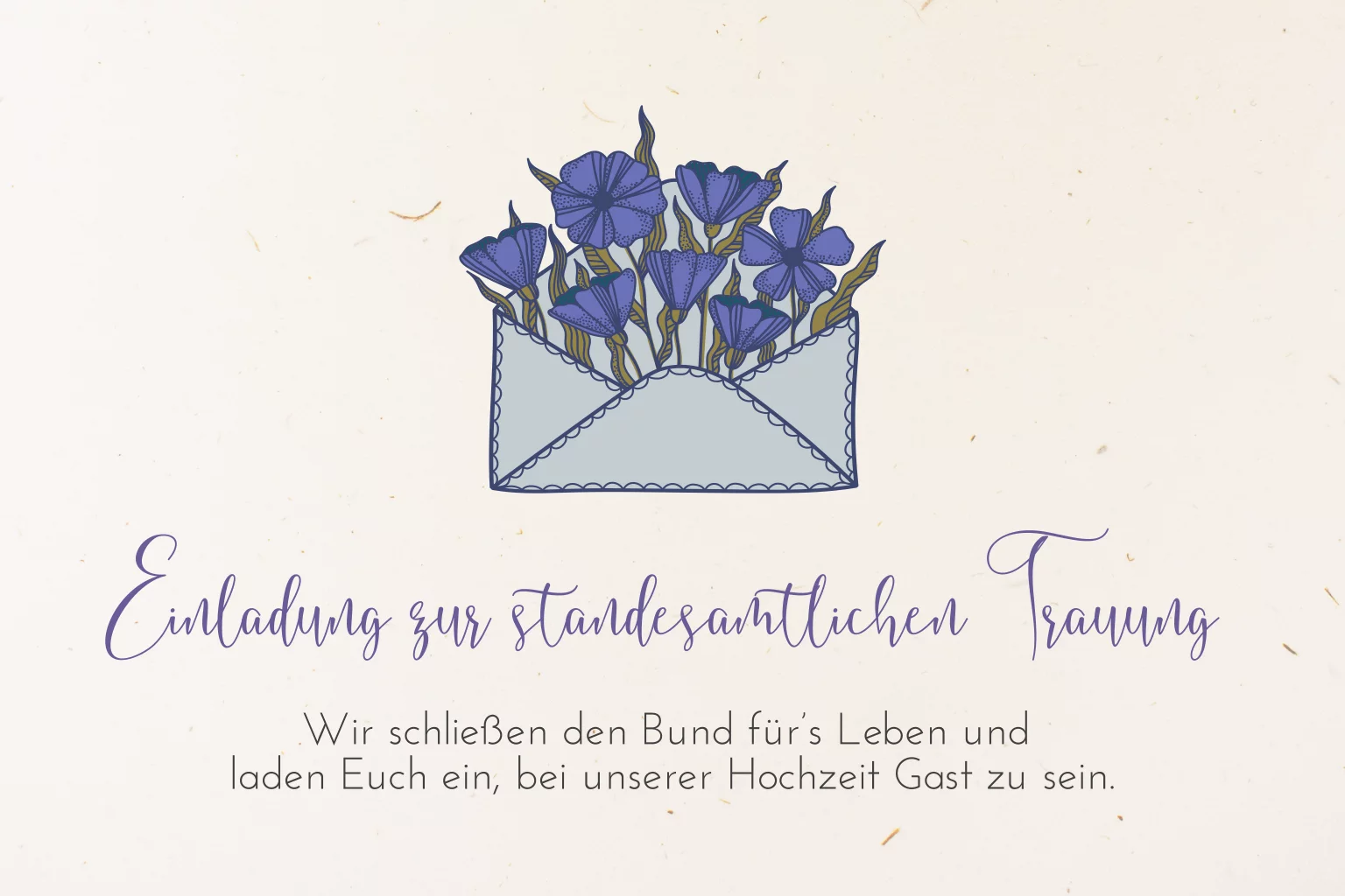 Einladung zur standesamtlichen Hochzeit aus Recyclingpapier. Die Postkarte mit floralem Umschlag Motiv in lila gibt dem Design eine frühlingshafte Note.