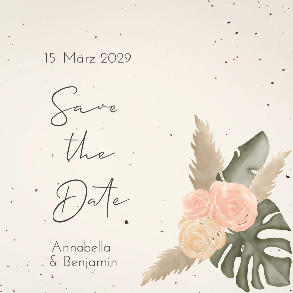 Quadratische Save the Date Karte aus recyceltem Tulpenpapier mit floralem Boho Element. Das Papier der Karte ist aus Tulpenpflanzenresten hergestellt worden.