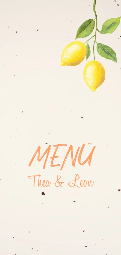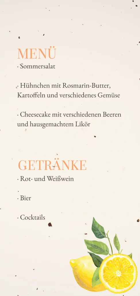 Speisekarte zur Hochzeit aus Recyclingpapier, welches aus Tulpenpflanzenresten hergestellt wurde. Die schlichte Klappkarte mit Zitronen ist perfekt sich für eine Sommerhochzeit.