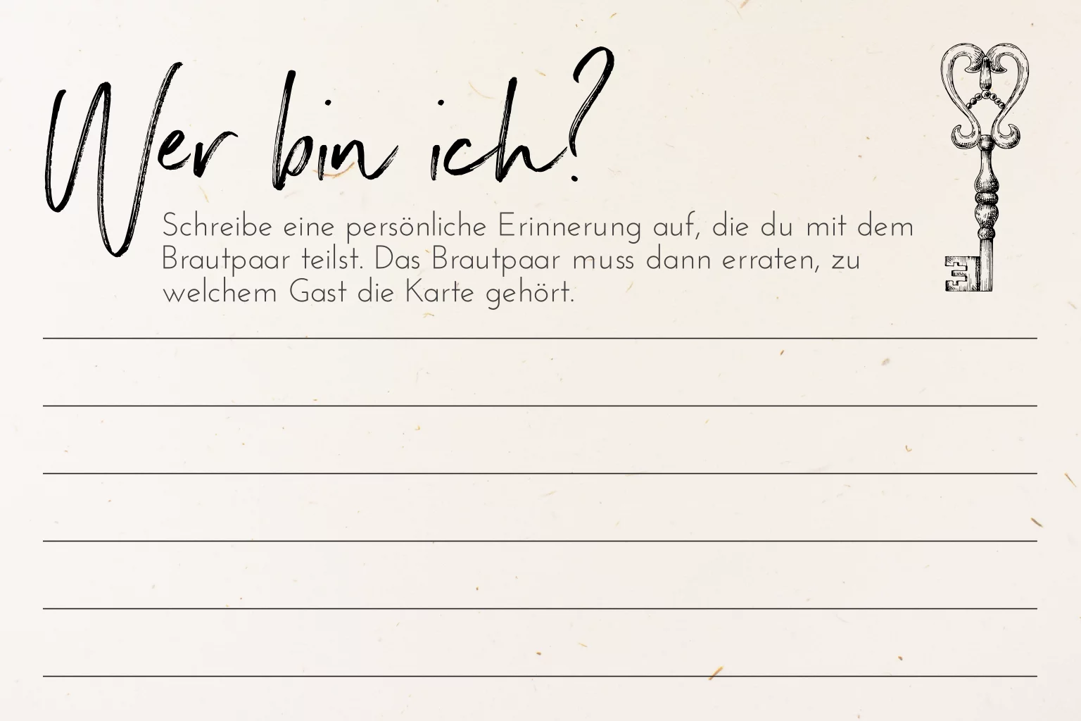 "Wer bin ich?" Spiel zur Unterhaltung der Gäste auf der Hochzeitsfeier. Die Postkarte aus Recyclingpapier mit Schlüssel in schwarz ist eine schöne Erinnerung für das Brautpaar an den großen Tag.