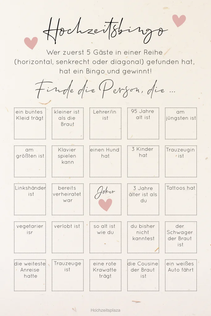 Hochzeitsbingo "Finde die Person, die ..." aus Recyclingpapier mit Herzen in rosa. Eine schöne Idee zur Unterhaltung Eurer Hochzeitsgäste.