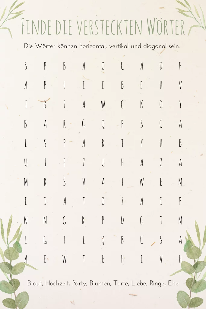 Kreuzworträtsel aus Recyclingpapier zur Gästeunterhaltung mit Greenery