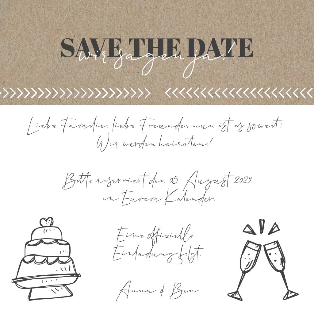 Einseitige Save the Date Karte aus Kraftpapier mit verspielter Schrift und Symbolen, wie Torte und Sektgläser. Die quadratische Karte ist auf der Rückseite leer.