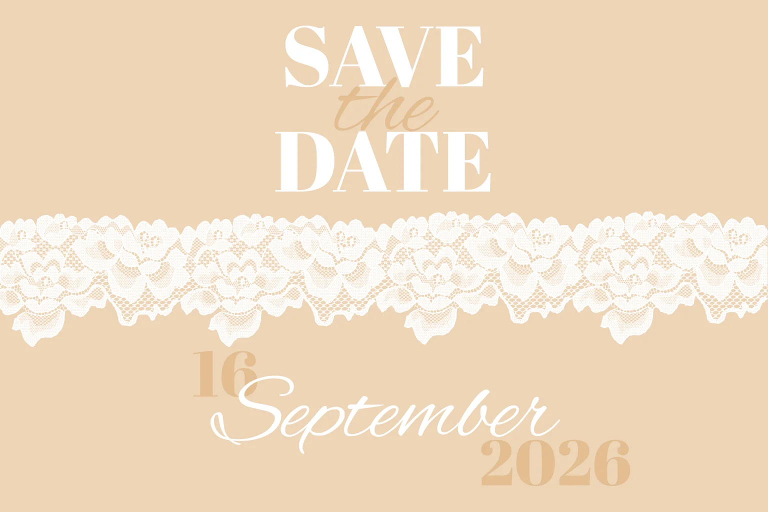 Mit dieser romantischen Save the Date Karte in zartem Apricot mit weißer Spitze regnet es nur so von Zusagen.
