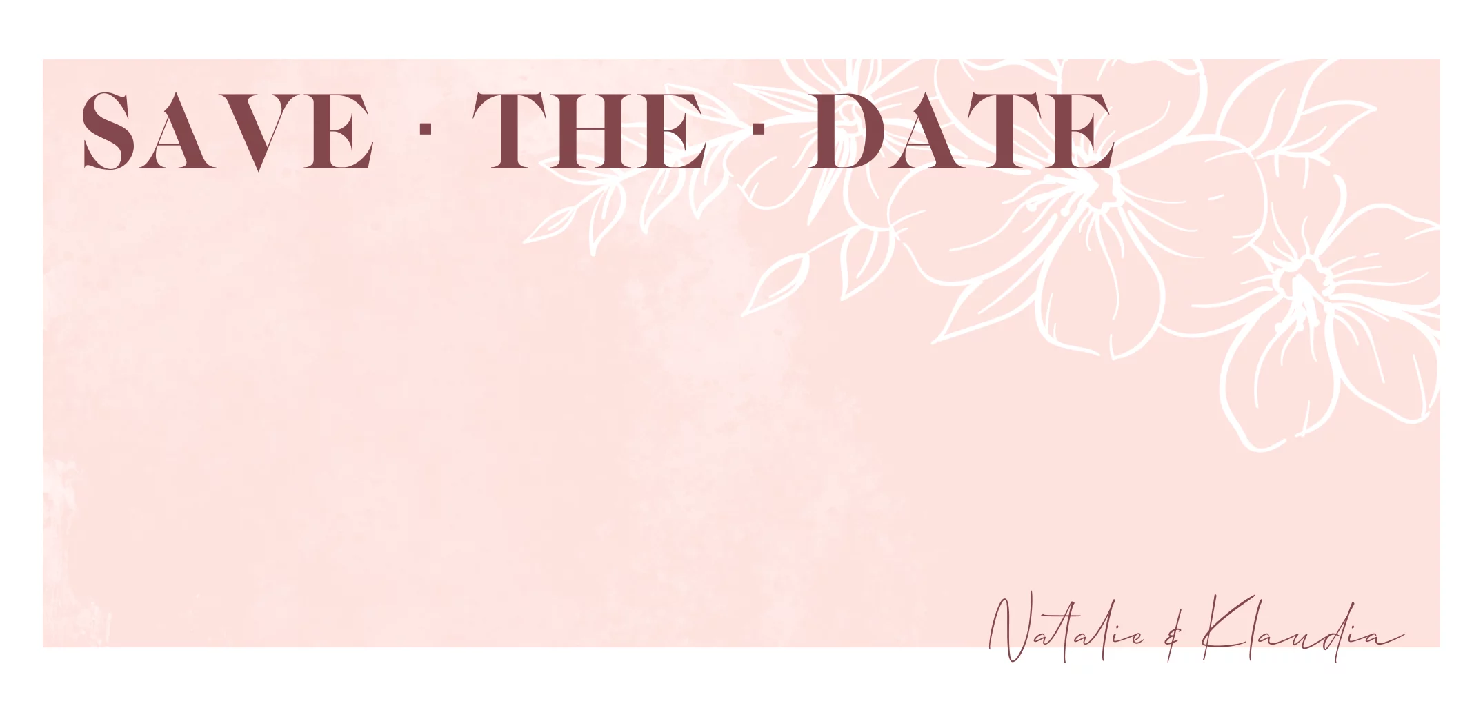 Save the Date Karte im Panoramaformat in rosa mit weißen Line Art Blumen. Die Rückseite hat ausreichend Platz für ein Foto.