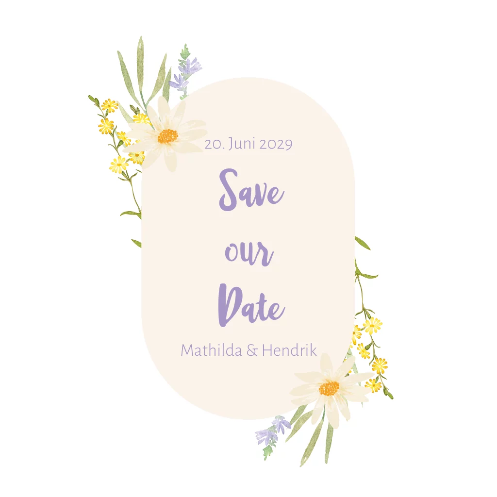 Hübsche, quadratische Save the Date Karte in weiß und beige mit bunten Blumen und lila Akzenten.