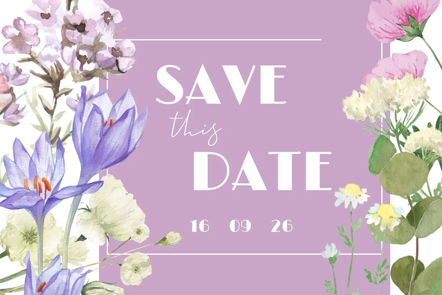 Diese Save the Date Karte in Pastell Lila zaubert den Frühling herbei. Die Postkarte mit Rahmen wird durch bunte Frühlingsblumen ergänzt.