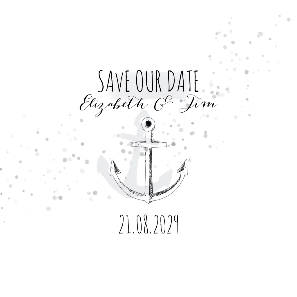 Weiße Save the Date Karte mit Anker und Sprenkeln in grau