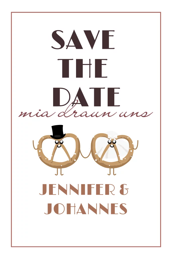 Gerahmte bayrische Save the Date Karte mit Brezel Hochzeitspaar