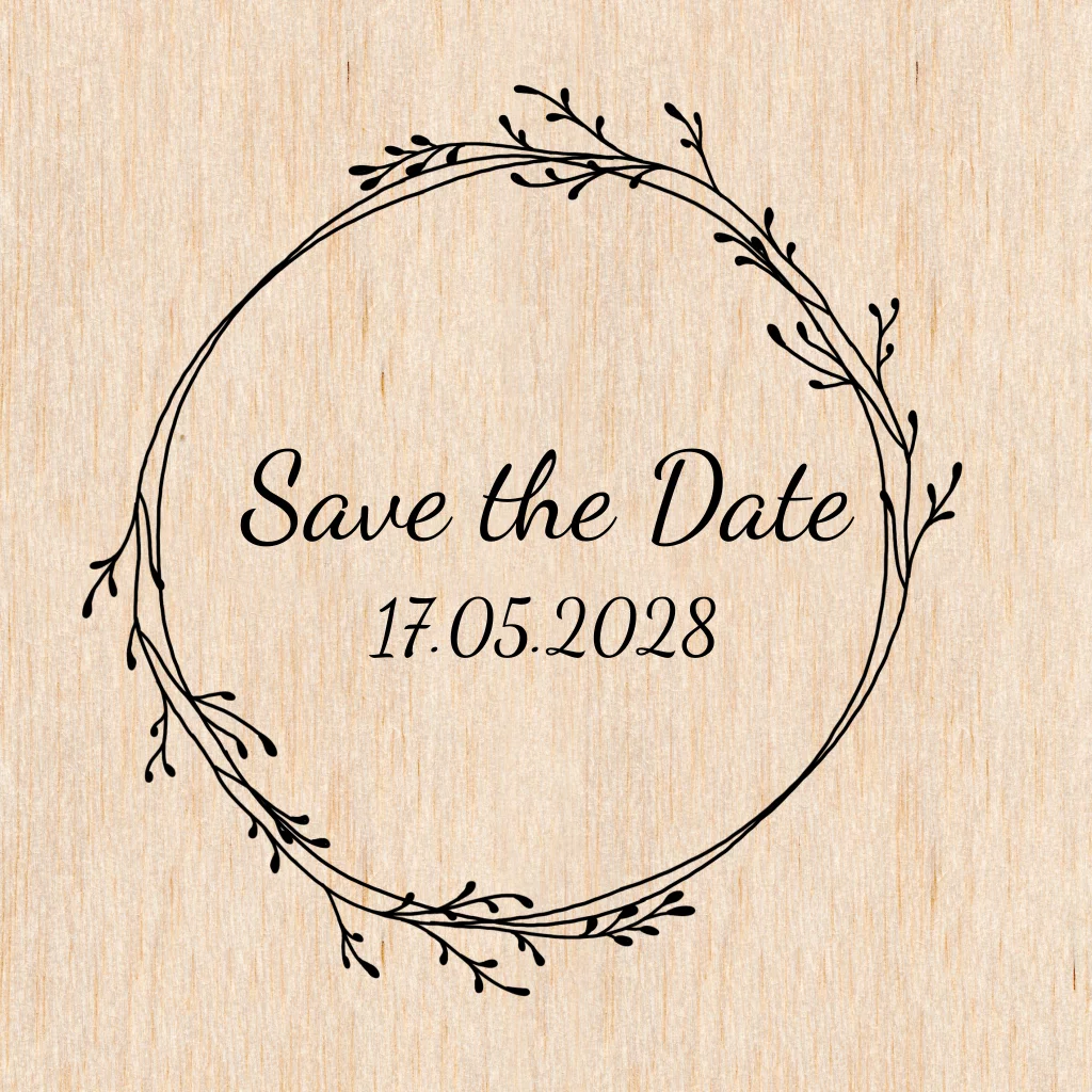 Save the Date Karte aus Echtholz mit Line Art Kranz