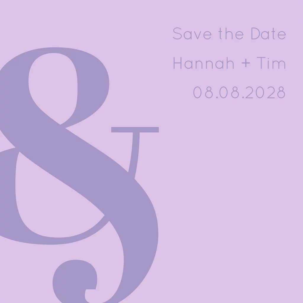 Lilafarbene extravagante Save the Date Karte in quadratischer Form mit großen &-Zeichen.