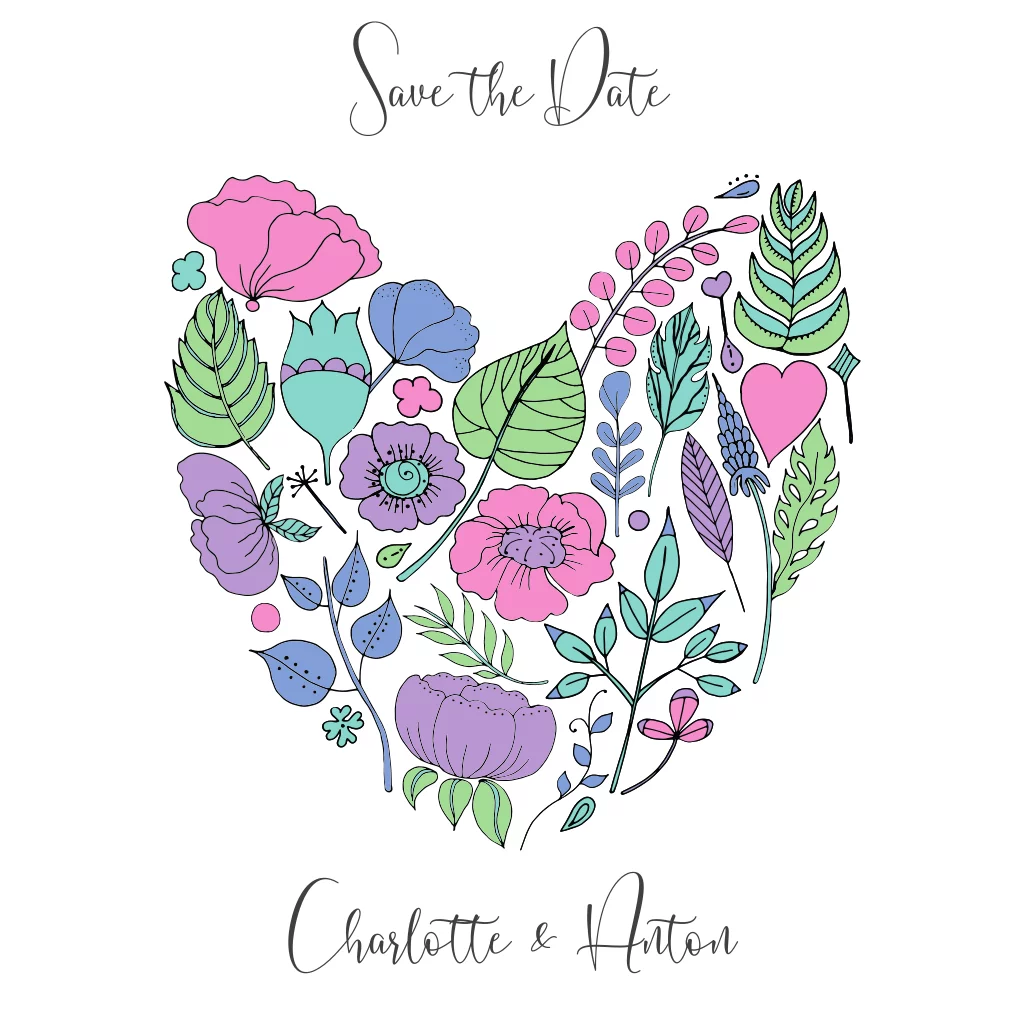 Quadratische Save the Date Karte mit buntem Blumenmuster in Herzform