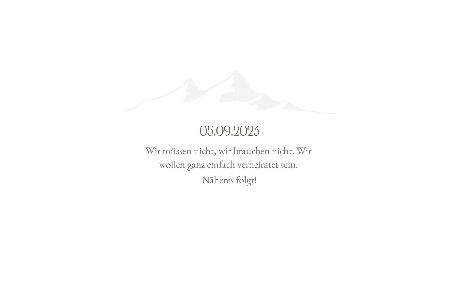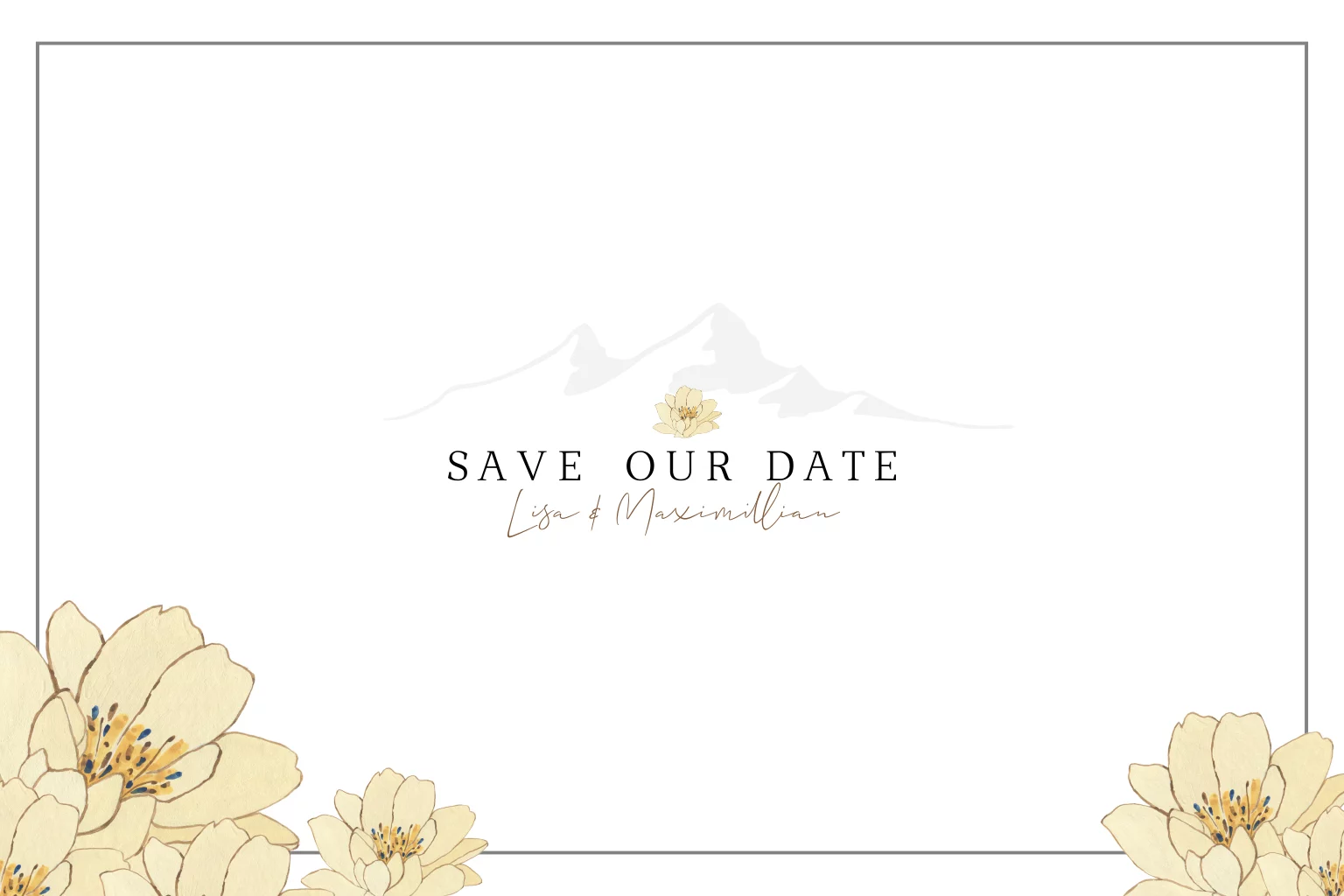 Weiße Save the Date Karte im Postkartenformat. Die Klappkarte hat einen zarten Rahmen und wird von gelben Blumen geziert. In der Mitte der Karte sind Berge platziert.