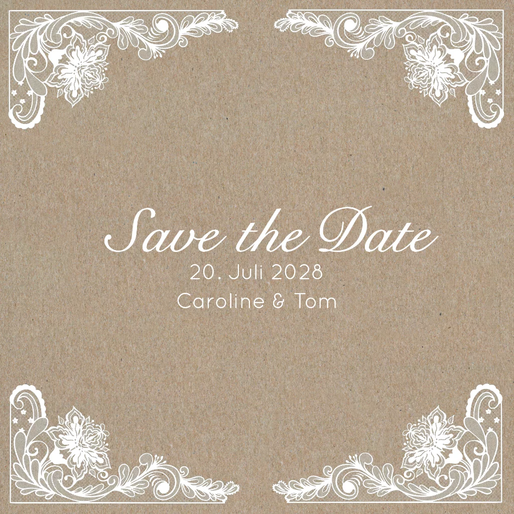 Save the Date Karte aus Kraftpapier mit edler Spitze in weiß und quadratischer Form.