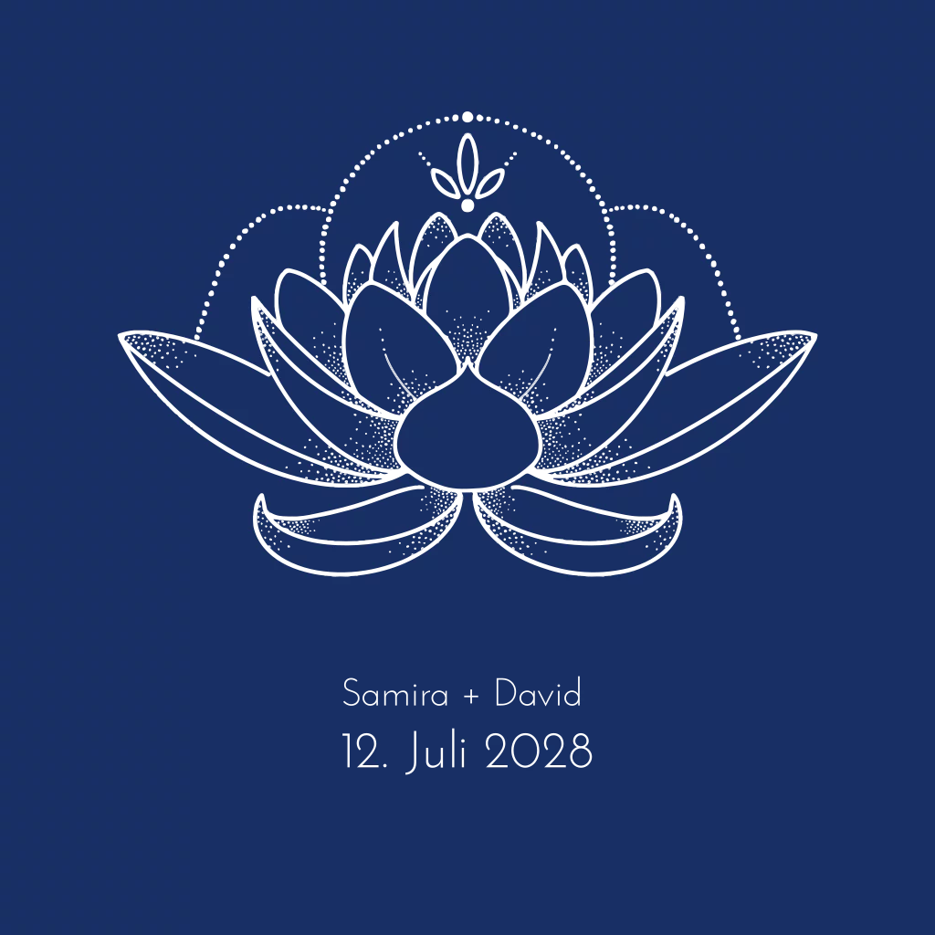 Blaue Save the Date Karte mit veredelter Lotusblume in Gold und quadratischer Form.