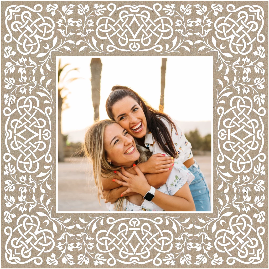 Quadratische Save the Date Karte mit geschnörkelten Greenery-Rahmen und Foto. Das weiße Muster kommt auf der Kraftpapierkarte besonders gut zur Geltung.