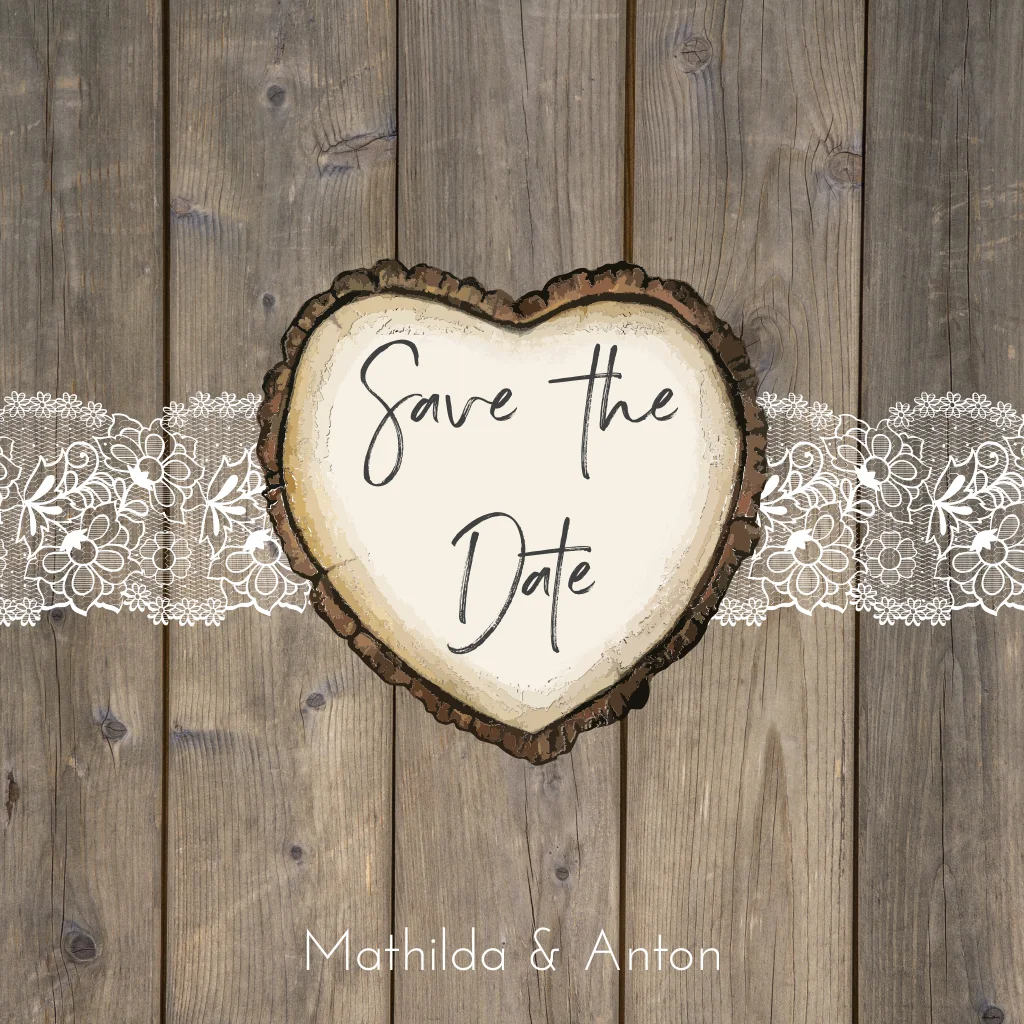 Rustikale Save the Date Karte in Holzoptik mit weißer Spitze und Herz